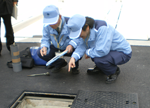 計画時に下水道管理者に提出された排水設備計画届出書や維持管理計画書をもとに、ディスポーザの設置状況等を現地で確認しています。また、使用開始後のシステムにおいては、維持管理計画書等から管理状況を確認するとともに、現地で採水した処理水を水質分析し東京都下水道局へ報告しています。