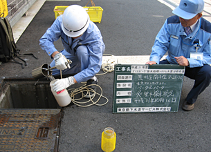 水質調査は、お客さま宅を戸別訪問し排水処理槽の処理水を採取した後、水質分析を行っています。