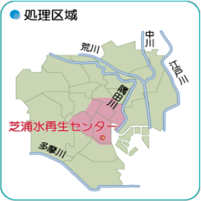芝浦水再生センターは、昭和6年に稼働した東京で3番目に古い水再生センターです。周辺環境は、かつての港湾倉庫街から、オフィスビルの立ち並ぶ都心の市街地に変貌しています。処理区域は、千代田・中央・港・新宿・渋谷区の大部分及び品川・文京・目黒・世田谷・豊島区の一部で、面積は6,440ヘクタールです。これは、JR山手線の内側の広さに相当します。