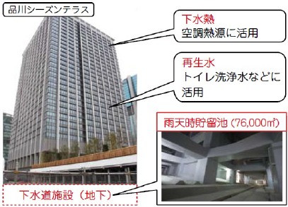 平成27年4月に供用開始した雨天時貯留池は、公共用水域の水質改善に貢献する施設です。また、センター上部に建設された品川シーズンテラスでは、下水熱や再生水などを活用して、空調熱源やトイレ洗浄用などに利用されています。