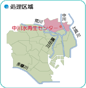中川水再生センターの処理区域は、足立区の大部分と葛飾区の一部(ほぼ常磐線以北)で、面積は4,442ヘクタールです。また、この区域は河川に囲まれているため、中川水再生センターが稼働するまでは浸水の起きやすい地域でした。この区域の大部分は、雨水と汚水を別々の下水道管で集め、雨水は川へ放流し、汚水は水再生センターで処理する「分流式下水道」になっています。