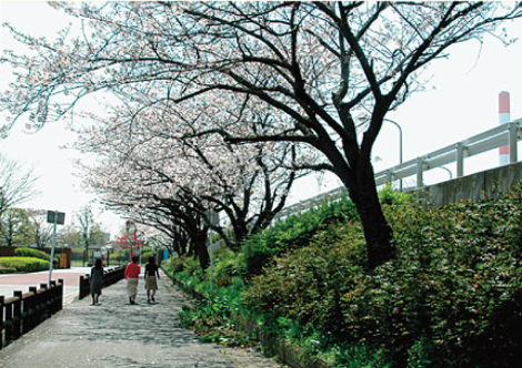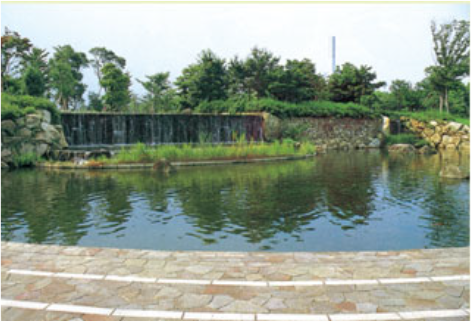 正門を入った左側の「おひさま広場」には、せせらぎ等、ビオトープがあります。また、「新砂大滝」の前には処理水を循環利用した池があり、コイなどが泳いでいます。