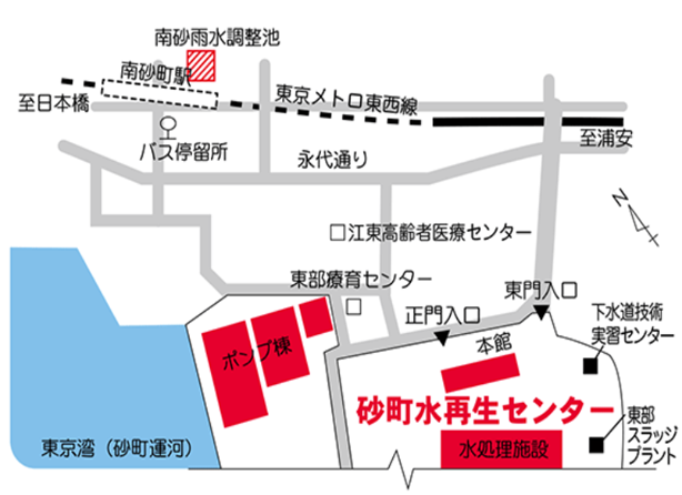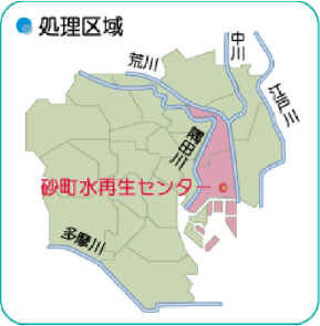 砂町水再生センターは、昭和5年に稼働した東京で2番目に古い水再生センターです。砂町処理区は、隅田川と荒川に囲まれた通称江東デルタ地帯で、墨田区の全部、江東区の大部分、中央・港・品川・足立・江戸川区の一部からなる広大な区域(6,153ヘクタール)から発生する下水を有明水再生センターとともに処理しています。