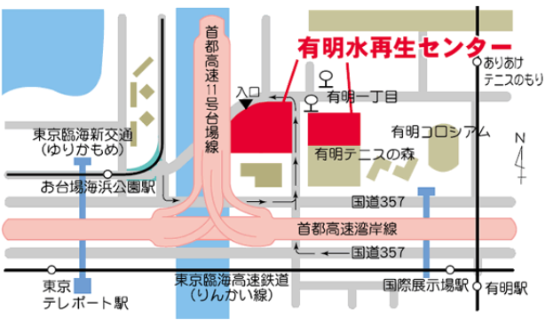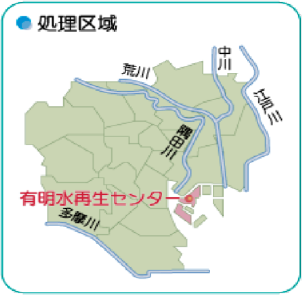 有明水再生センターは、分流式汚水処理施設であり、臨海副都心のクリーンセンター内に設置されています。処理区域は、砂町処理区の一部(臨海副都心とその周辺地域及び中央防波堤内側埋立地の一部)です。