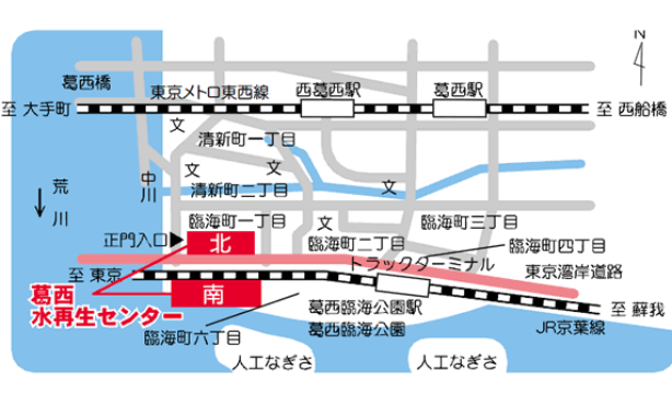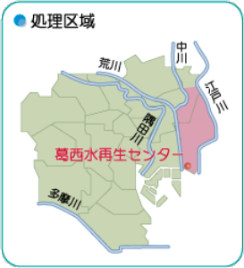 葛西水再生センターは、荒川の河口に位置し、首都高速湾岸線を挟み南北の施設からなっています。処理区域は、荒川と江戸川に囲まれた江戸川区の大部分と葛飾区の一部で、面積は4,893ヘクタールです。