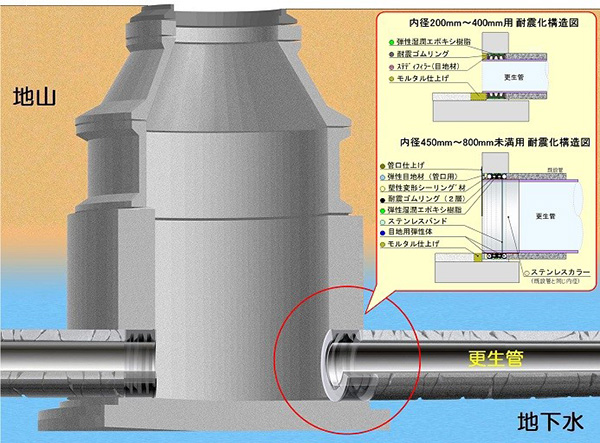 本工法は、老朽化した既設管を更生した管とマンホールとの接続部を対象とし、更生管の抜出し・突出し、屈曲等に対応する耐震性能を付加させるために、更生前に非開削でフレキシブルな構造に改造する耐震化工法です。