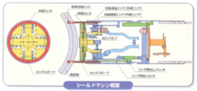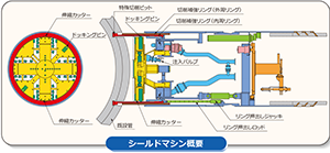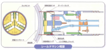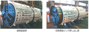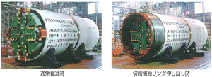 | W方式の接合方式は、切削補強リングが地山の崩壊防止用の外周リングと既設管きょを切削する内周リングの二重構造である。 本方式は、管きょ接合場所の地盤補強や止水が困難な場合、既設管きょに止水壁の設置が困難な場合等に用いる。 | S方式の接合方式は、切削補強リングが一重で地山の崩壊防止用と既設管きょの切削を併用している。切削に伴う止水は、既設管きょ内部にコンクリート壁を設置し、さらに注入用パイプにて止水材を注入する。 本方式は、管きょ接合場所の地盤補強や止水が容易な場合、既設管きょに止水壁の設置が可能な場合等に用いる。 |
