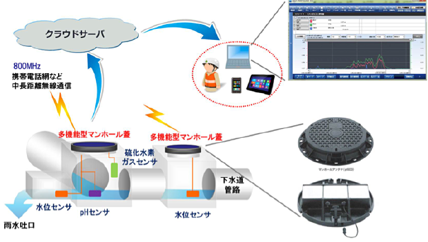 本装置は、マンホール蓋に通信用のアンテナ、伝送装置、バッテリーを装備することで、下水道管きょ内の水位や硫化水素濃度等の測定を行い、携帯電話通信網を利用し、リアルタイムに情報を提供するものです。