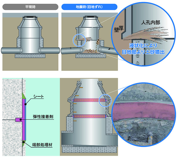切削したマンホール目地部にエポキシ樹脂を充填し、シートを接着することにより、地震動による側塊の横ずれを抑制するとともに、常時および地震時の水密性を確保し、マンホール内への土砂等の流入を防止します。