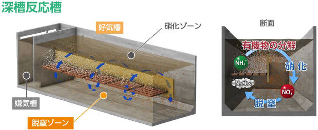 好気槽内で好気ゾーンと脱窒ゾーンを作り出し、硝化と脱窒を同時に行うことで、高度処理並の水質を達成できる処理技術です。