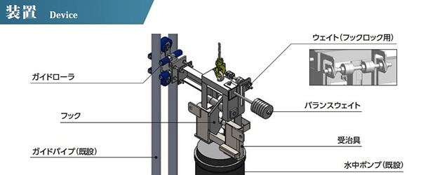 本装置は、着脱式水中ポンプの昇降作業を安全かつ効率的に実施するために開発された装置です。従来に比べ、メンテナンス業務における事故の危険性が低減でき、作業員の負担も軽減できます。