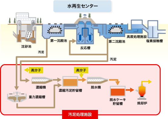 下水を処理すると汚泥が発生します。この汚泥は、濃縮、消化、脱水、焼却などの処理工程を組み合わせたシステムにより、処理された後、処分や再利用が行われています。