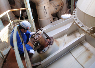 脱水ケーキは、搬送されて焼却炉に投入されます。焼却炉で短時間に焼却処理を行うと、灰として最終的な姿になります。この灰は、埋立て処分をするために、混練施設で処理を行い、指定処分場に送られます。また資源化のため、利用もされています。